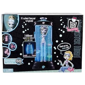 Lagoona Blue is the daughter of the infamous Sea Monster. After a long week at school, Lagoona Blue is dead tired and in need of a little rest and relaxation. Lagoona uses her Hydration Station to re-moisturize at night, which doubles as room décor for girls. Just press the shell-shaped button on the front to activate 3 different modes of lights and bubbles for a cool underwater room effect. This toy includes a Hydration Station, Lagoona Blue doll with eye mask, pet Neptuna with eye mask, water bottle and monsterizer bottle. Also, check out the rest of the Monster High Dead Tired Doll Collection, which is sold separately.